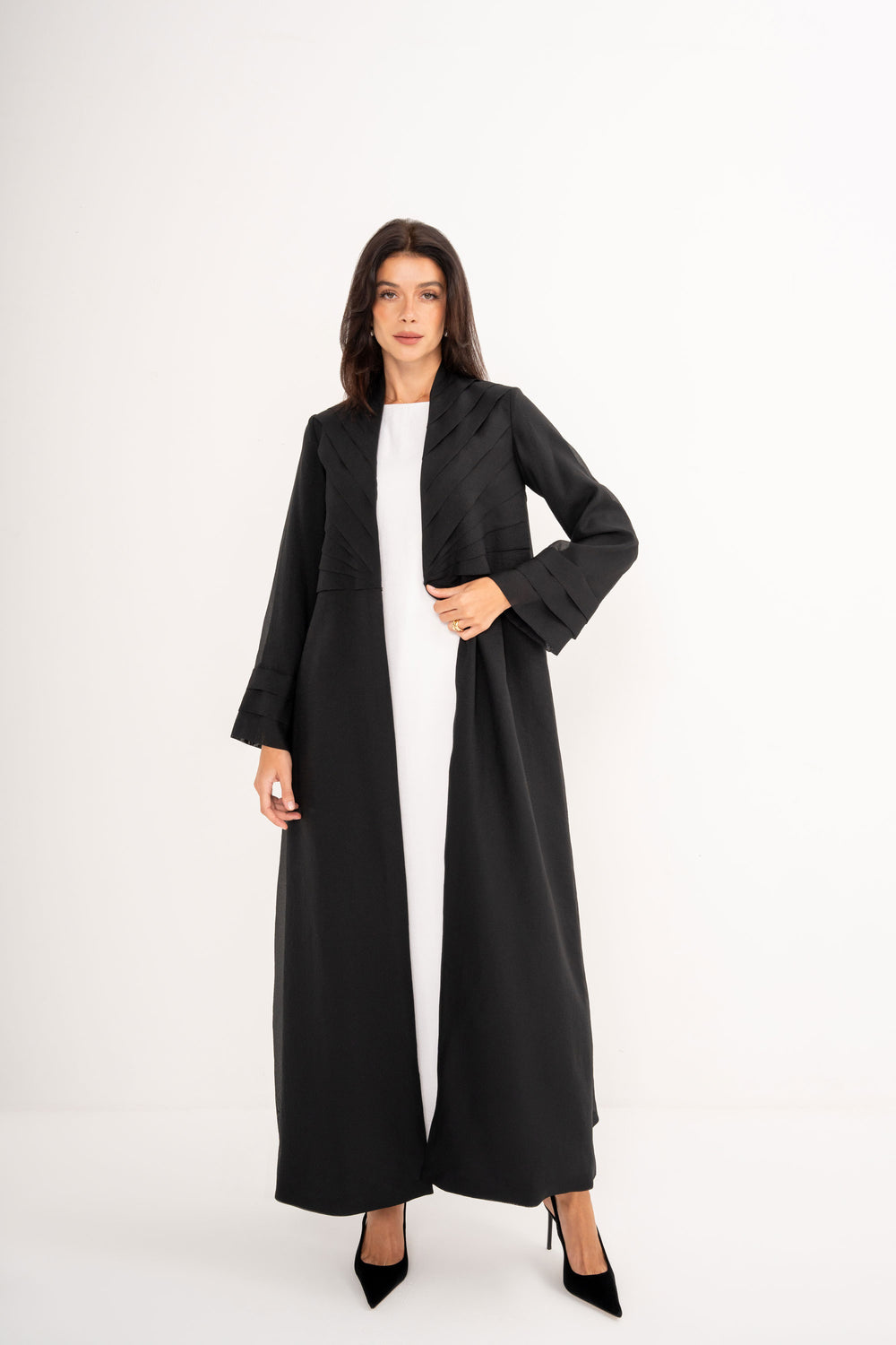 Elegantly crafted in black organza, this abaya features delicately detailed sleeves that add subtle movement and refinement, draping beautifully over the silhouette.
